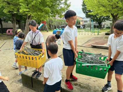 今日は、朝からとても暑い一日でした。そんな暑い中でしたが、養正小学校の子どもたちは、暑さに負けることなく、むしろ『自分たちが使う公園をきれいにするのだ』という熱い気持ちをもって朝からお掃除をがんばっていました。素晴らしい。そして、お決まりになってきたクリーンキャンペーンの後の後片付け。今日も4年生の子どもたちが、掃除に使った道具を自ら進んで片付けてくれました。いつもありがとう。