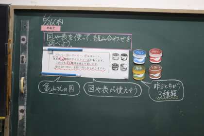 本来の問いは、組み合わせが何通りあるのか考えるものだったのですが、昨日の魔法陣がそのままだと使えないと子どもたちは混乱気味でした。しかし、つぶやきをきっかけに新たな考えが生まれたり、魔法陣を生かした考え方が生まれたりと、みんなでいろんな意見を見つけることができました。