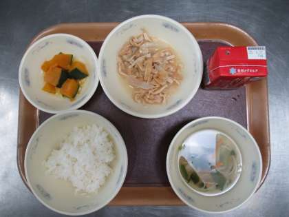 今日の給食は ごはん 牛乳 きつね丼の具 かぼちゃの煮つけ 七夕そうめん です。一足早い七夕の行事献立です。