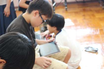 何をしているのか子どもたちに聞いてみると、「リズムを作ってるんです!」と教えてくれました。電子音はメトロノームのようなリズムを刻んでいるもので、そこに様々なリズムの音を重ねていくということをしていました。