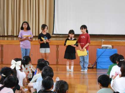 7月のにこにこ集会では、6月に学習したふりかえりをクラス代表児童に発表してもらいました。その後、6年生の「マナーの達人10か条」についての発表を聞きました。発表の中で、2年生でも大事にしている「時間」についての話がありました。子どもたちは真剣に話を聞き、集会後には、意識して動いている子もいました。