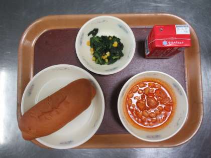 今日の給食は 黒糖コッペパン 牛乳 大豆と鶏肉のトマト煮 ほうれん草のソテー でした。