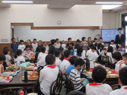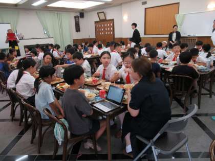 今日は3年生と4年生が上海の小学校の子どもたちといっしょにランチルームで給食を食べました。