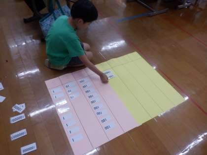 一万をこえる数について学習しました。10000が5個、100000が2個など位ごとに数を数える活動をしながら、大きな数の仕組みを学びました。