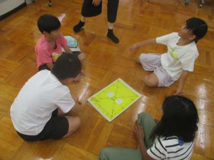 今月のにこにこ目標は「となりの国について知ろう」です。4年生は、コリアの伝統的な遊び「ユンノリ」を体験することを通して、日本ととなりの国であるコリアの文化にふれました。