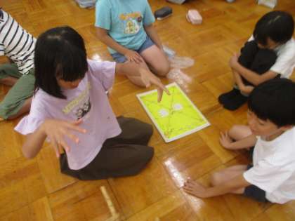 体験する前からとてもワクワクしている様子の子どもたちでしたが、ルールややり方の説明を聞き、実際に遊び始めるとあちらこちらから楽しそうな笑い声が聞こえてきました。体験した子どもたちからは、日本の遊びの「すごろく」と似ているという声が聞こえてきました。これからも様々な国の様々な文化に触れ、国際理解を深めていってほしいです。