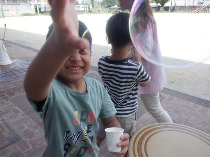しゃぼん玉であそびました。たくさんのしゃぼん玉を見て、おおはしゃぎでした。夢中でしゃぼん玉にさわりにいきました。