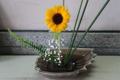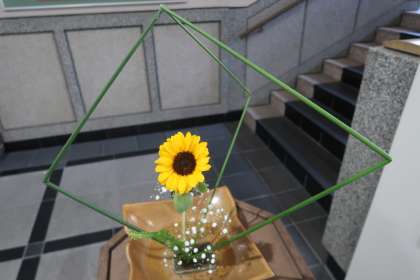 今月の生花教室は、フトイ、ヒマワリ、カスミ草、玉シダを生けました。フトイの様々な使い方を先生に教えていただきました。茎を曲げて使う斬新な生け方が素敵でした。
