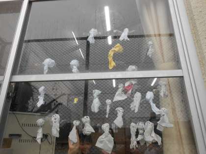 今日は2年生さいごの水遊びの学習の日ですが、外は大雨。先生から「中止」と言われることを覚悟していたようです。しかし、「雨が弱まったタイミングで入るよ!」と言われ、子どもたちは大喜びでした。「虹が虹が 空にかかって...」と大熱唱。そして休み時間には、てるてる坊主をつくっていました。そのおかげで雨が弱まり、プールに入ることができました!子どもたちの思いが届いたようですね。