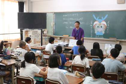 ちなみにみなさんは黒板に描かれているキャラクターはご存じでしょうか。なぜこのキャラクターだったのかは子どもたちを通して聞いていただけたらと思います。