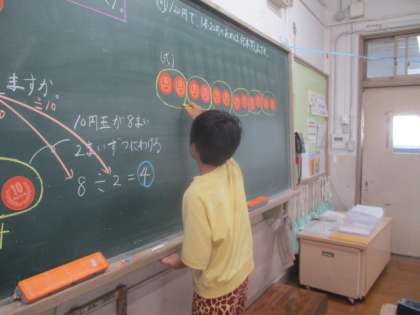 答えは、80÷20=4本です。でも実は、10円玉を使って考えることで違う式をたてて考えることができるのです。その考え方にたどり着いた子どもたちは、具体物を使って考えることの良さと、一つの問題でもいろいろな考え方ができるのだという良さに気付くことができていました。
