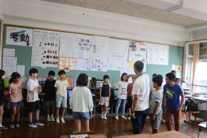 見えないかもしれませんが、算数です。前回は偶数奇数について学んでいましたが、今回は倍数について学習していました。倍数を実際の人で数をとらえながら考えていきました。これは公倍数や公約数の考え方にもつながっていきます。子どもたちも、頭の中で倍数を考えながら体も動かしつつ理解しようとしていました。