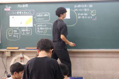 算数です。今日は円の面積を求める公式を生かしてオムライスの形の面積を求めました。問題に出会った瞬間は、どうやって求めたらよいのか戸惑っていた子どもたちですが、きっかけをつかみだすと、水を得た魚のように楽しそうに鉛筆を動かしていました。解決できること、わかることはやっぱり楽しいのですね。