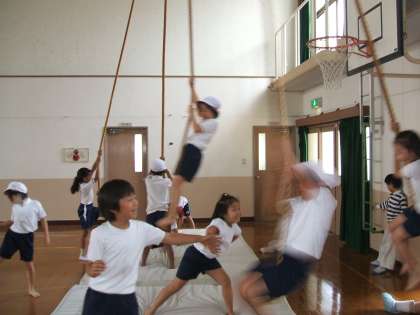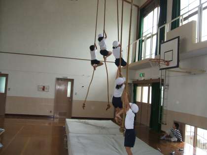 体育の学しゅうでは,なわのぼりをしました。のぼりぼうとはちがい,なわがふらふらするのでみんな上までのぼるのにくろうしました。「手がいたい。」「体があがらない。」「高いとこがこわいよ。」と言いながら,手と足の力をつかった運動をすることができました。
