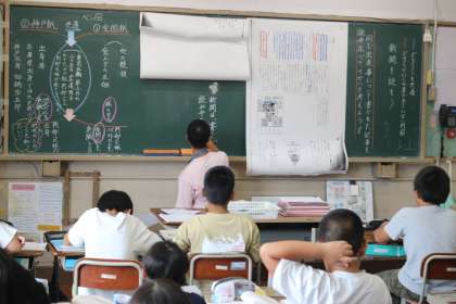 違いは、そもそも地方紙であることと、全国紙であることです。それぞれの書かれ方から、共通点や相違点をとらえ、ベン図に整理していきました。ベン図、ご存じでしょうか。最近は様々な思考ツールがありますが、これもその1つです。ツールは思考の流れをより明確にしてくれます。子どもたちも黒板を見ながら、共通点が浮き彫りになっていくのをしっかりとらえていたようです。