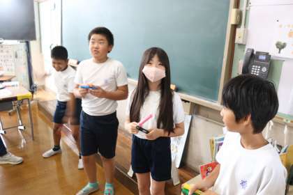 今回は、約数について学んでいた子どもたち。12本の花を何個の花瓶にならあまることなく分けられるのかを考えました。ペンを花に見立てて、実際に花瓶に分けていくことで、どういう数はあまらずに分けられて、どういう数はダメなのか。そういった視点から考えを深めていました。もちろん文章から想像して考えることも大事ですが、こういった経験がイメージをふくらませることにつながります。やはり具体物は大切ですね。