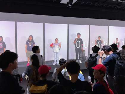 NTTパビリオンの最後の部屋に入る前に、1人ずつ写真を撮りました。そして次の部屋に入ると、その写真が変化していき、踊り出したり、微笑んだり、年齢が上がったり下がったり。不思議な演出に、みんな引き込まれていました。