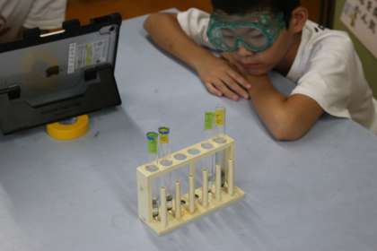 理科では、金属にうすい塩酸を入れるとどうなるのかを調べてみました。子どもたちは、お弁当箱やスプレーなどに書かれた文章から、一緒にしてはいけないことは分かっていたものの、どのようなことが起こるのかわかりませんでした。予想では、さびる、形が変わる、もろくなる、少しずつとけるなどの意見が出ました。
