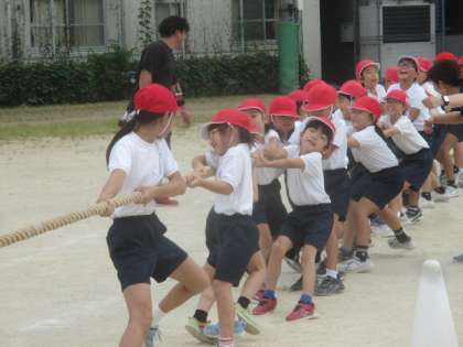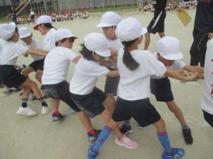 全校練習では、開会式、綱引き、応援練習を行いました。2年生の子どもたちは、体を後ろに倒して全力で綱を引いたり、「無敵の白組!」と大きな声で歌いながら応援ダンスを踊ったりと、元気いっぱい、全力で取り組んでいました。