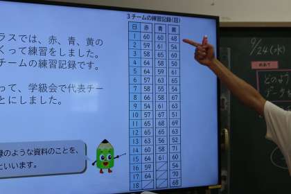 その後最高記録や最低記録にも目を向け、自分の見方ならばどのチームを出場させるのか話していました。青チームが平均値では赤チームと並んで良かったこと、そして最高最低の幅も狭いという視点から、青チームが人気でした。しかし、その話し合いによって見方によって変わることに気づいた子どもたちでした。