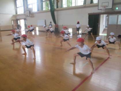運動会に向けてソーラン節の練習をがんばっています。力強い「どっこいしょー!どっこいしょー!」のかけ声と共に、少しずつ力強い動きで表現ができるようになってきています。