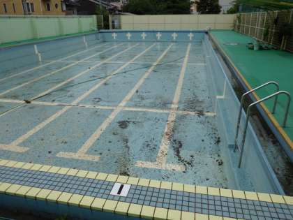 プール周辺の木を切っているので,水を抜いたあとのプールの壁面や底の様子が以前と比べてきれいです。