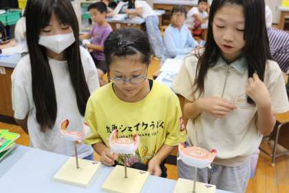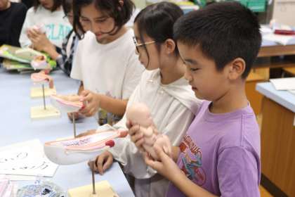 理科です。子どもたちがこれまでに調べてきたことを整理しながら、最終の確認をしていました。その中で実際のサイズの模型を見るなどして、よりイメージを持ちやすくする時間をとっていました。