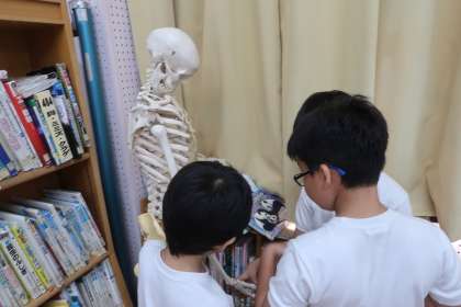 理科の「ヒトの体のつくりと運動」の単元で、体のしくみを調べる学習をしました。自分の体をさわって、骨のある場所や曲がるところを見つけた後で、骨の模型や図鑑、映像資料などを使って体が曲がるところを詳しくしらべました。