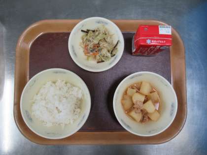 今日の給食 ごはん 牛乳 肉じゃが(ピリからみそ味) ごま酢煮 です。