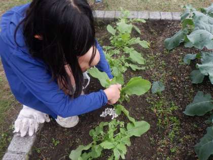 大根を間引いて追肥をしました。5年生が中心になって大根のお世話の仕方をみんなに教えることができました。さつまいもは立派に育ちました。とれた時の喜びも大きかったです。