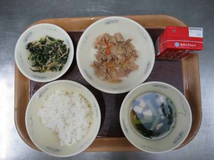 今日の給食は ごはん 牛乳 豚肉のしょうがいため ほうれん草ともやしのごま煮 すまし汁 です。