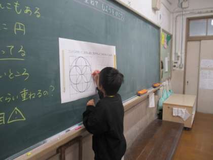 線がたくさん重なった図形の中から、円を見つけ出し、半径と中心を考えて手本と同じ模様を描くことができましたね。複雑に見えますが、よく見ると、円が浮かび上がってきましたね。
