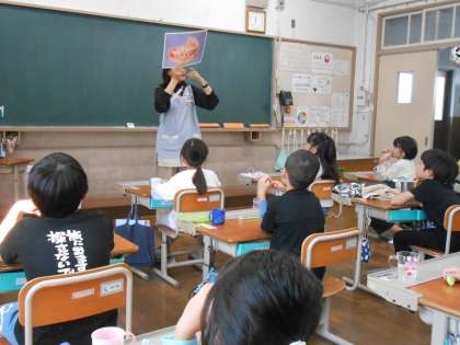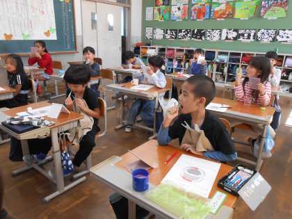 養護教諭による、歯磨きの仕方の学習がありました。歯の話や歯磨きの仕方、歯垢の染出しを行いました。子どもたちは「歯と歯茎の間が染まった!」「大人の歯になってるから頑張らないと」と鏡を見ながら丁寧に歯を磨いていました。