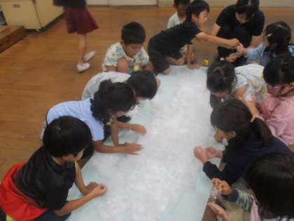 くじらぐもに乗っている自分も作り、みんなで貼り合わせ完成です。