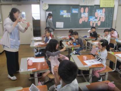 養護教諭の先生に来ていただき、はみがきの大切さやはみがきの仕方を教わりました。