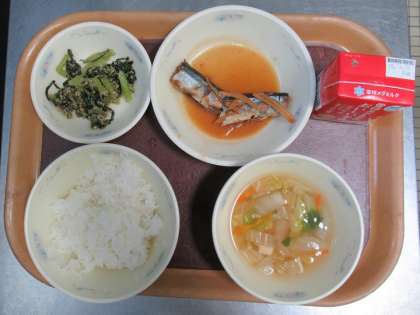 今日の給食は ごはん 牛乳 さんまのかわり煮 小松菜のごまいため 白菜の吉野汁 です。