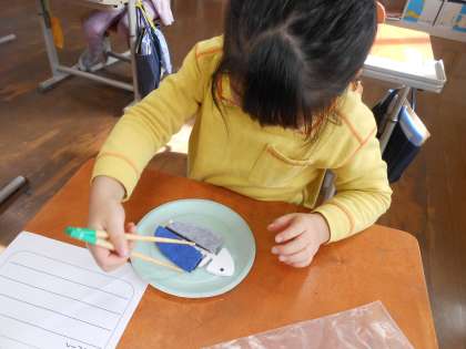 食育の学習では、魚の食べ方についての学習をしました。子どもたちは「骨があるから苦手」「時間がかかる」「お肉の方が好き」と給食では、魚はいつも人気がありません。しかし、学習をした日の給食では、全員が残すことなく、骨をきれいに取って食べることができました。クラス全員、お魚名人に認定です!