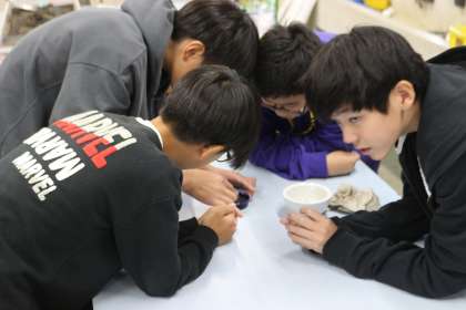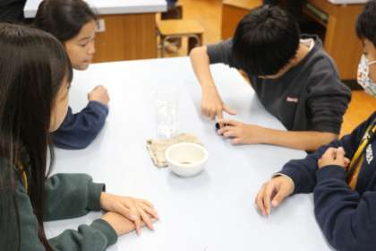 ということで火山の噴火の様子をきっかけに、火山灰を調査してみることにしました。細かいものは、顕微鏡で見ると子どもたちから案を出してくれたのですが、そのまま見ると真っ黒のかたまりに見えます。そこで、班ごとに火山灰を洗ってみることにしました。水を注いでは指でやさしく磨く。すぐに水がにごります。今日はそこまでで時間が来てしまいました。