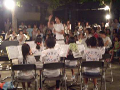 午後7時から養正ふれあい音楽会が始まりました。学校の前の飛鳥井公園で実施され今年で29回目です。養正金管バンド部は「FIRST BROW」他6曲を演奏しました。今日の日を目標に練習をしてきました。まだ完成されていませんが、レパートリーも増え、気持よく演奏できました。たくさんの方に声援をいただき、ありがとうございました。