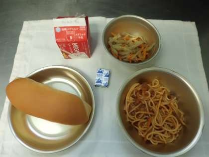 今日の給食は,小型コッペパン・牛乳・スパゲティのミートソース煮・ごぼうのサラダ・角チーズでした。大好きな献立のスパゲティ。ミートソースを煮込むいいにおいが廊下にただよっていました。子どもたちは「おいしそうなにおい・・・・お腹がすいたなぁ・・・早く食べたいなぁ」と楽しみにしていてくれました。