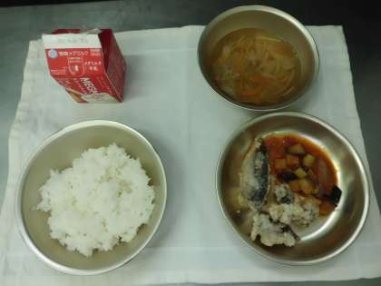 今日の給食は,ごはん・牛乳・あじのからあげ・ラタトゥユ・スープでした。ラタトゥユは,夏野菜をオリーブオイルなどでいため,トマトと一緒に煮込んだ料理で,フランスの家庭料理です。今日はズッキーニとなすの夏野菜を使いました。あじのからあげと一緒に食べるとより一層おいしく食べられました。「おいしい・・」と好評でした。