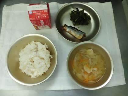 今日の給食は,玄米ごはん・牛乳・さんまのかわり煮・ほうれん草のおかか煮・すまし汁でした。今日のすまし汁は,鶏肉・キャベツ・にんじんを使ったもので,キャベツのよしの汁のとろみのないものです。かつおのだしがよくきいておいしかったです。
