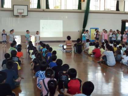 17日(火)ににこにこ集会がありました。児童会代表の司会のもと,まず2年生の発表でした。2年生はこれまで学級で朝の会の時間などで取り組んできたたくさんの詩を発表しました。中には論語も含まれていて,ずいぶんいろいろな内容のものを覚えていることがわかりました。最後は北原白秋の「お祭り」の群読でした。かわいいだけでなく迫力も感じさせてくれました。