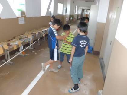 まきじゃくを使って,教室やろう下の長さをはかりました。まきじゃくを使うと,長いながさがはかれる, カーブのある場所もはかれる, とたくさんの発見をしていました。