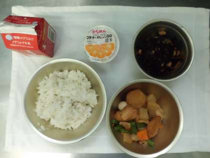 今日の給食は,麦ごはん・牛乳・平天とこんにゃくの煮つけ・ひじき豆・みかんゼリーでした。和食の献立でごはんとよくあいました。ひじきや大豆を使った献立で,鉄や食物繊維を多く含む献立でした。