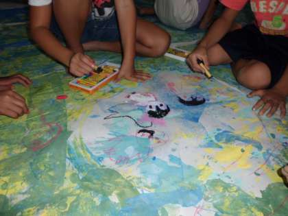 みんなでつくった氷の上に,ペンギンを描きました。 氷の上で遊んでいるペンギンや,お話しているペンギン,親子のペンギンなど,氷の上があっという間ににぎやかになりました。