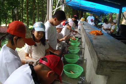3日目は,魚つかみをしました。池の中のイワナを軍手でひょいとつかまえます。つかまえたイワナをきれいに洗い,包丁を使ってお腹をさいてわたを出します。この作業はなかなか大変です。串にさすのもコツがいり,一人では難しい場合は友達に助けをかりながら進めていました。焼くと,魚のいいにおいが漂います。焼けるまでの時間が待ち遠しい!そして,焼き上がったイワナのとてもおいしいこと!!