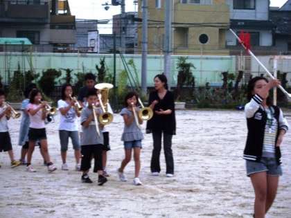 明日はいよいよ全校練習。入場行進は金管バンドの演奏によって始まります。今日は前日ということもあって,金管バンドのリハーサルを運動場で行いました。