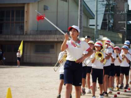 今日は空の様子がとても美しくまさに秋を感じるさわやかな天気となりました。1,2時間目が運動会の全校練習でした。昨日の部活動で遅くまで練習を重ねていた金管バンドが主役です。三色旗,金管バンドに続いて,各色の選手入場です。黄,赤,青組の順で入場行進をしました。