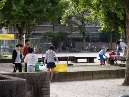 早朝からいつものように児童会代表がはさみなどを準備してくれています。水曜日に合わせていつもの曜日よりも早い目に登校する児童が何人も見られます。飛鳥井公園の他の場所にも出張でゴミ拾いに出かけてくれる児童もいます。
